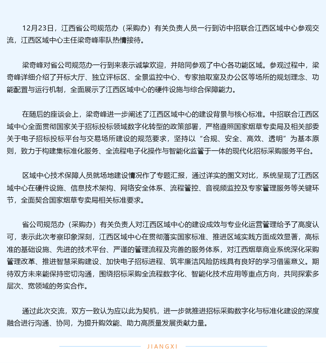 江西省公司规范办(采购办)一行到访中招联合江西区域中心深入交流招标采购数字化实践