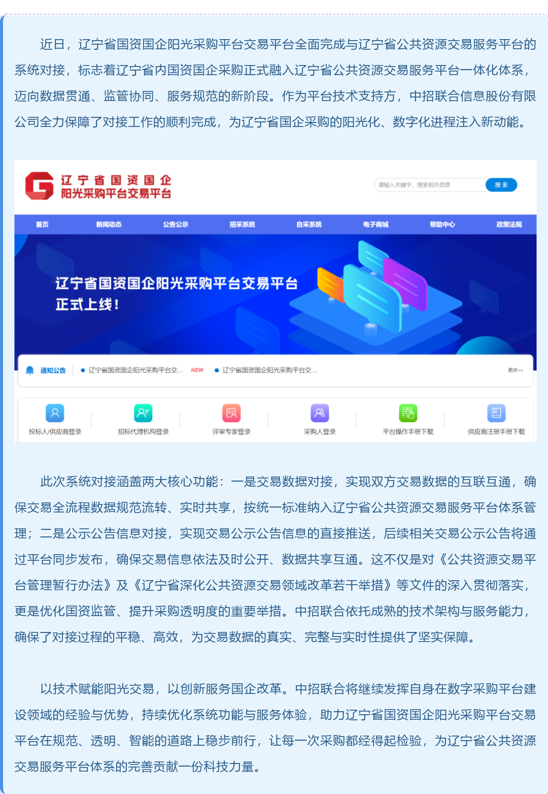辽宁省国资国企阳光采购平台交易平台与辽宁省公共资源交易服务平台完成系统对接